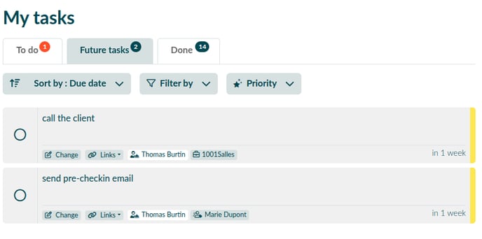 A task can be assigned to one and only one team member, has a priority, a due date, a text, and is linked to an entity (client, company, or file).