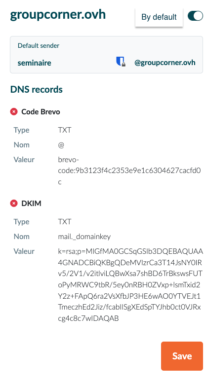 - Default sender: Enter the email address you have chosen as the default sender. For example "contact@monnomdedomaine.com", enter this address.