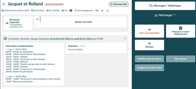 Les produits ou packages demandés (ex. chambres, salle de réunion, repas)