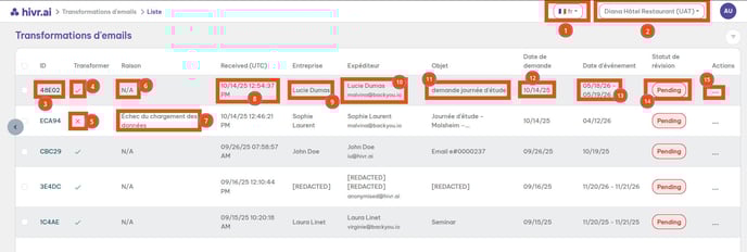 Pour qu'un email analysé devienne une demande sur Backyou, il doit respecter plusieurs critères. Dans le cas où l'un de ces critères n'est pas respecté, l'email ne devient pas une demande, dans l'interface ci-dessus il sera noté comme non transformé et la colonne "Raison" vous permettra d'en savoir plus sur la raison de l'échec.